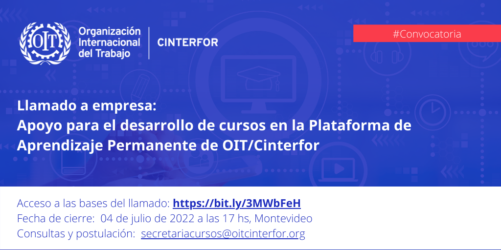 Este llamado tiene por objetivo contratar los servicios externos de una empresa para brindar apoyo durante el ciclo de diseño instruccional, desde el análisis hasta la evaluación, de los cursos ofertados en la Plataforma de Aprendizaje Permanente de OIT/ Cinterfor.