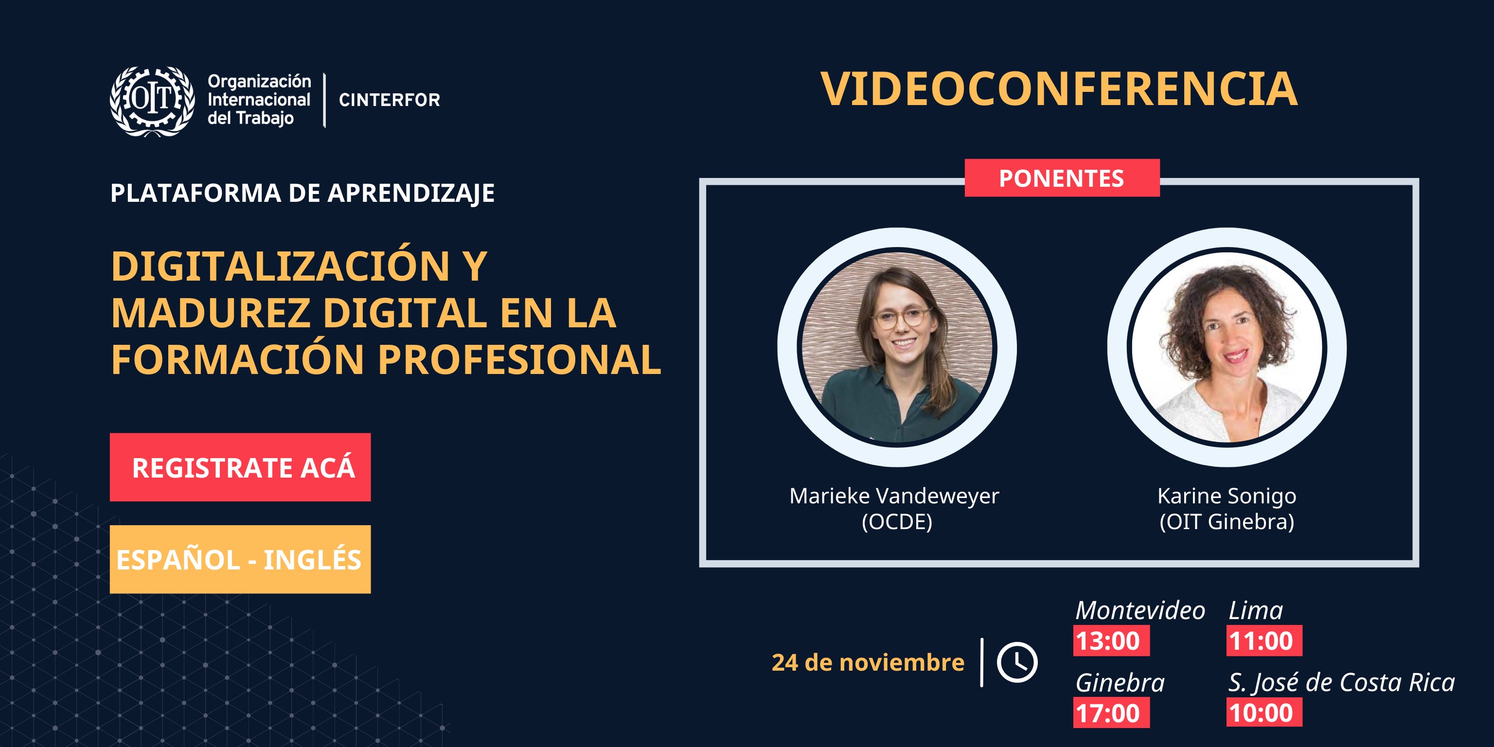 El jueves 24 de noviembre OIT/Cinterfor llevó a cabo esta videoconferencia sobre madurez digital en la formación profesional, que contó con la participación de dos destacadas panelistas: Karine Sonigo, especialista del equipo de Skills de OIT y Marieke Vandeweyer especialista de OCDE. La moderación estuvo a cargo de Rodrigo Filgueira, especialista en digitalización de OIT/Cinterfor.